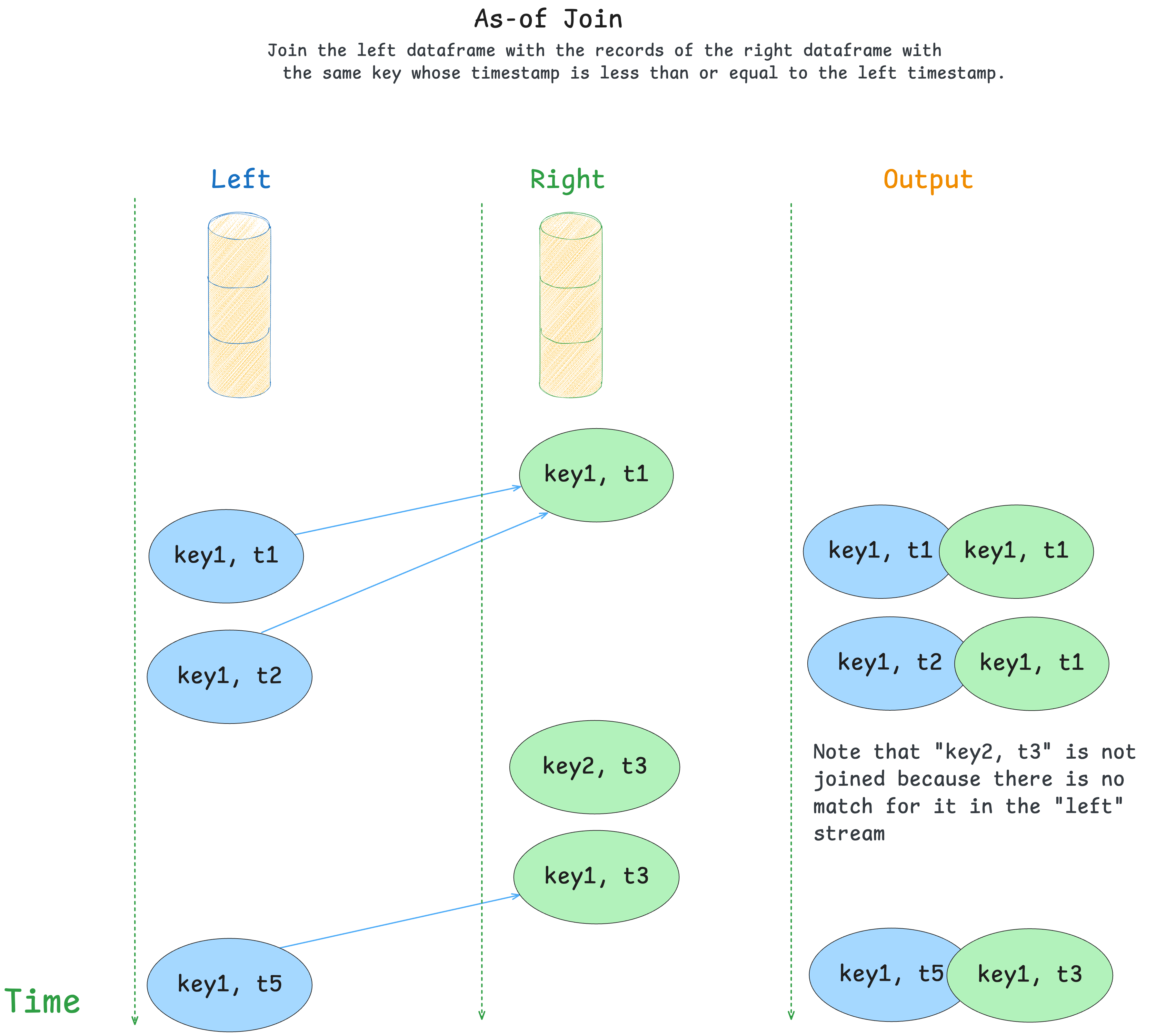 - Records on the left side query the right store for the values with the same key and the timestamp lower or equal to the record's timestamp.