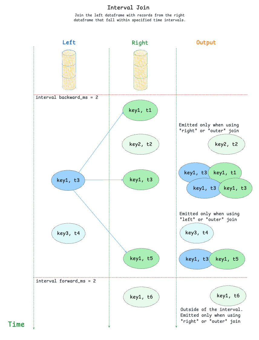This join is useful for cases where you need to match records that occur within a specific time window of each other, rather than just the latest record (as in as-of join).