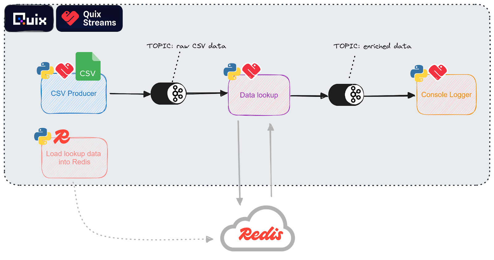 The script initializes a Quix application, and a Redis connection. Upon receiving data from on the input topic, it enriches it with the lookup information from Redis.