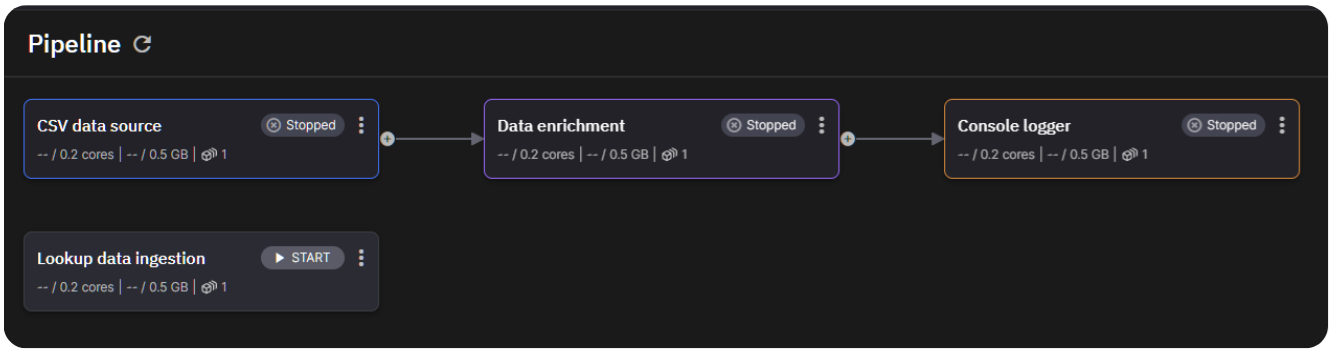 Let’s run this final piece of the puzzle. Return to the pipeline view and click the Start button for the “Data enrichment” deployment (in the top-right corner of the “Data enrichment” panel)