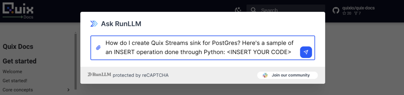On the Quix documentation portal, we have an “AskAI” widget powered by RunLLM that you can click in the bottom right corner. This is better than asking for a general purpose AI tool because it has been configured to use our codebase and documentation as its main knowledge source.