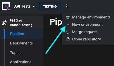 There are several ways you can create a new environment, if you've not created one as part of creating the project. For example, you can do it from the top-level kebab menu: