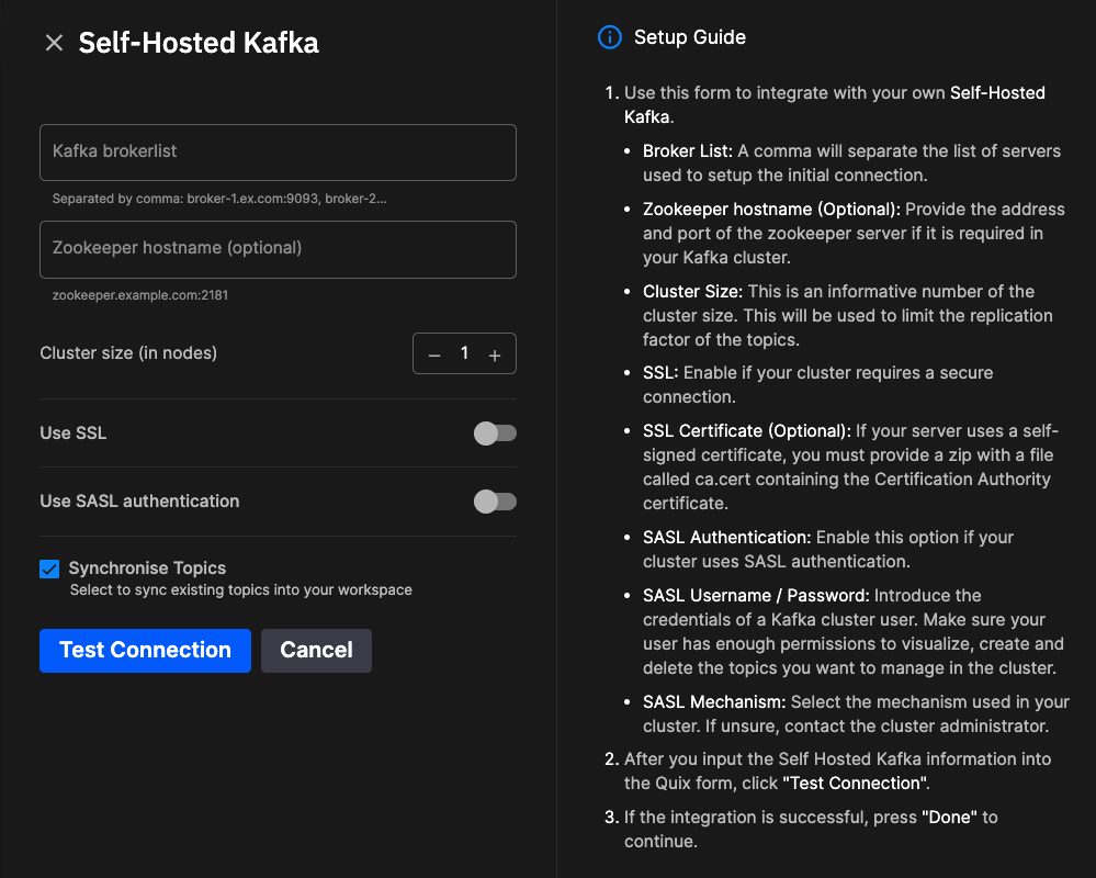 If you want to install and manage your own Kafka installation, you can do this too, as long as the Kafka Cluster is available on the Internet. You'll need to do more configuration, and be very familiar with details of Kafka hosting and configuration. Selecting this option presents you with a setup guide: