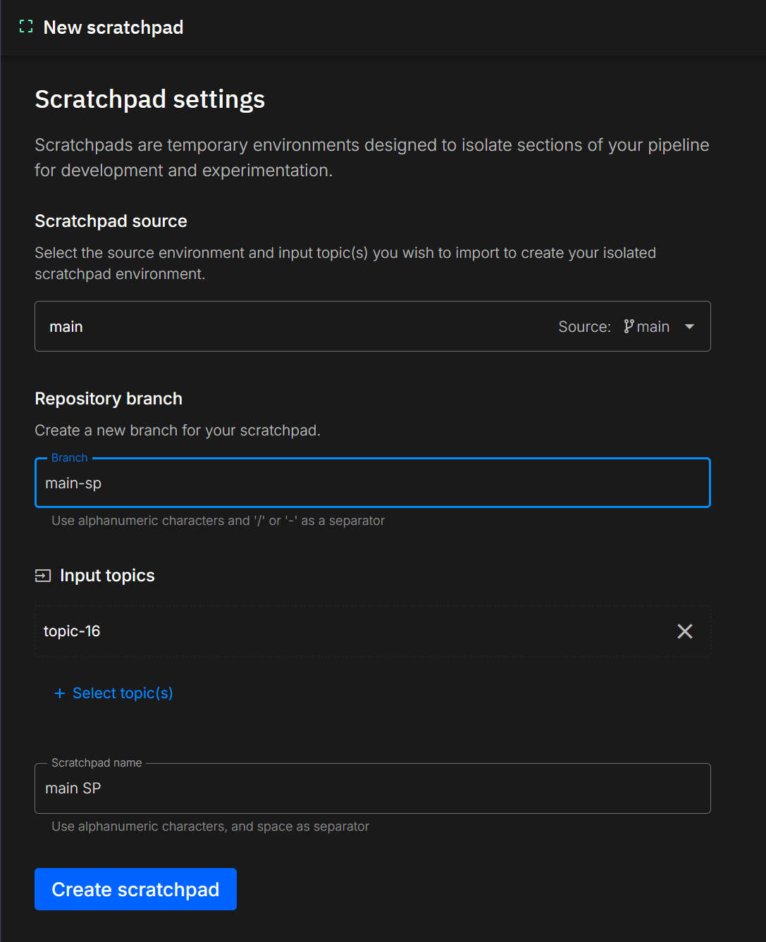 Both methods redirect you to the scratchpad creation page, where you can configure the settings as needed.