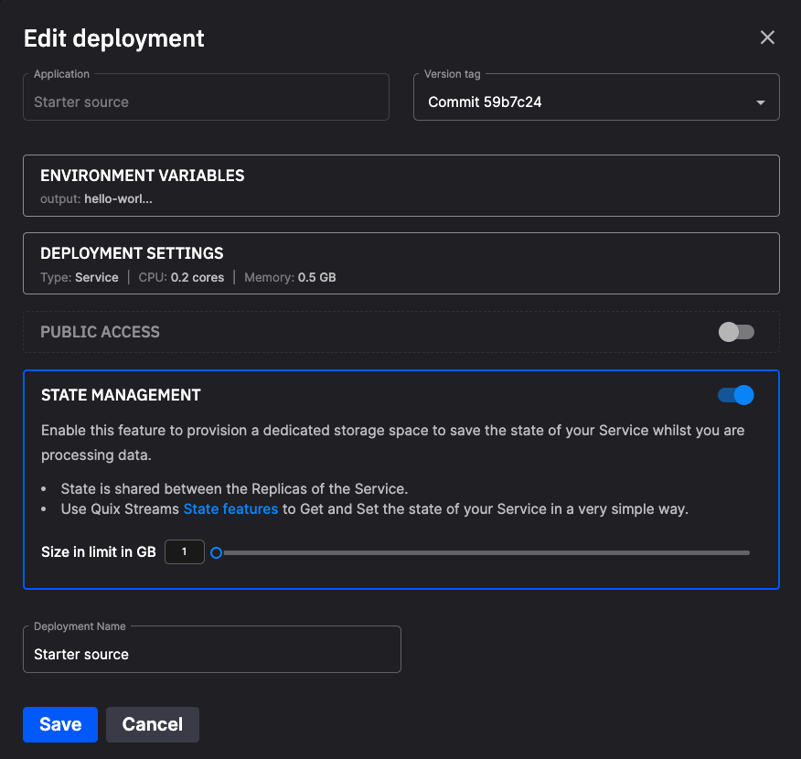 If you have enabled state management for a service, then you can also use the state management features of Quix Streams in that service. This enables you to store and retrieve data in various formats, and retain that state between service restarts. See the Quix Streams documentation for further details.