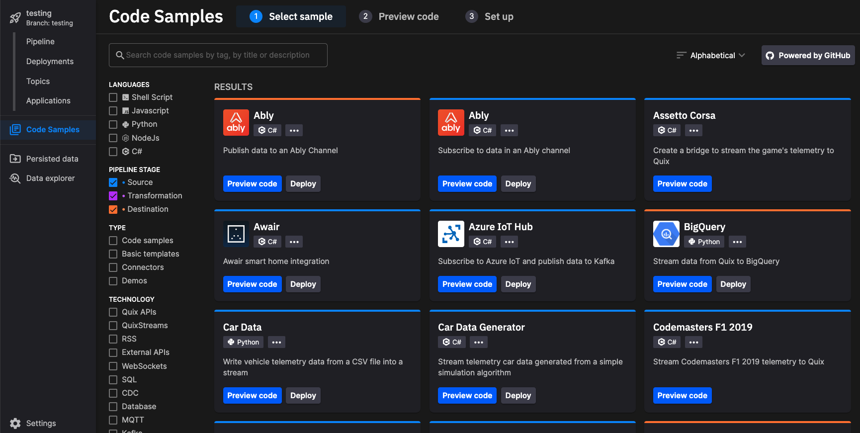 Note that when you use a public code sample in Quix, it is added to your private repository, so any changes you make can be kept private if you so wish. Of course, if you are working in a public repository, then any code samples you add or modify will also be public.
