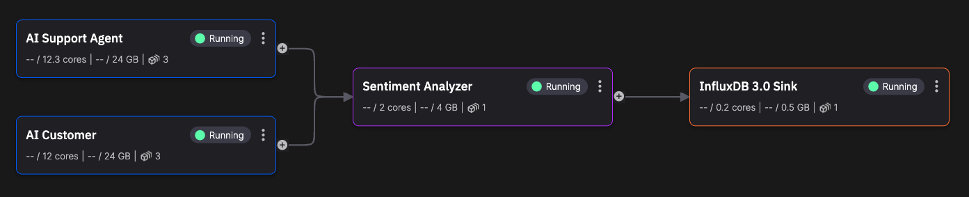 The applications (services) are connected in the pipeline by topics. The services run in dockerized containers managed by Kubernetes. The following screenshot illustrates a simple pipeline.
