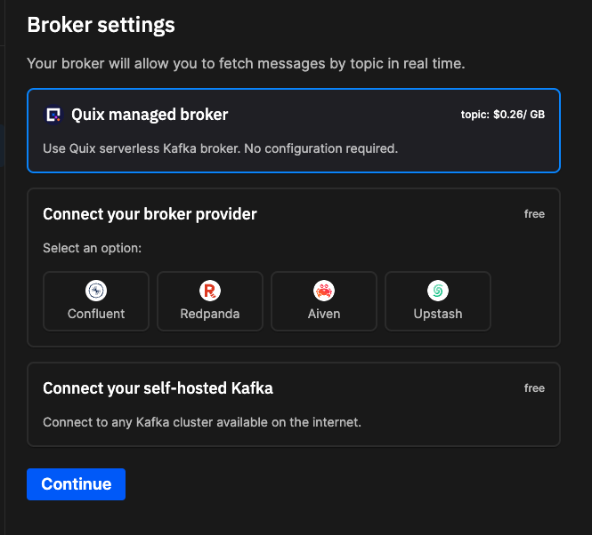 When you create an environment in Quix, you are presented with the Broker settings dialog. This is where you can select the Kafka broker you want to use, as shown in the following screenshot: