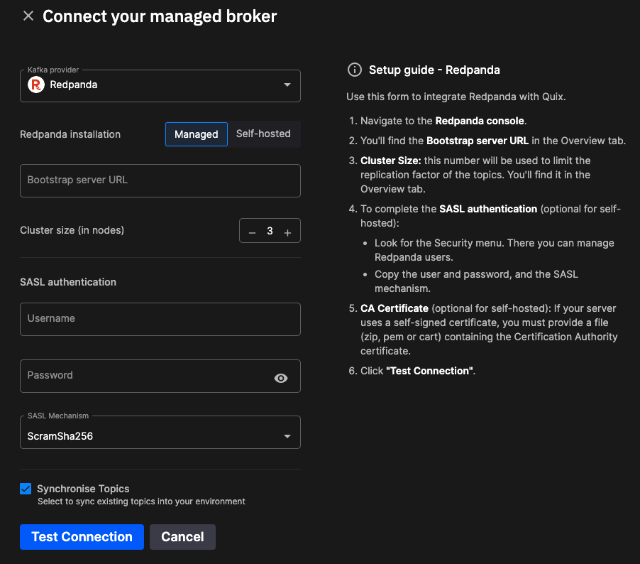 When connecting to a provider, each option comes with its own setup guide. Simply follow the instructions in the setup guide to connect Quix to your preferred broker. For example:
