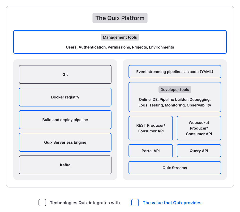 Quix is a complete platform for building, deploying, and monitoring streaming data pipelines. It enables software developers, data scientists, and data engineers who use Python to focus on app development and extracting value from real-time data pipelines, rather than dealing with the underlying infrastructure.