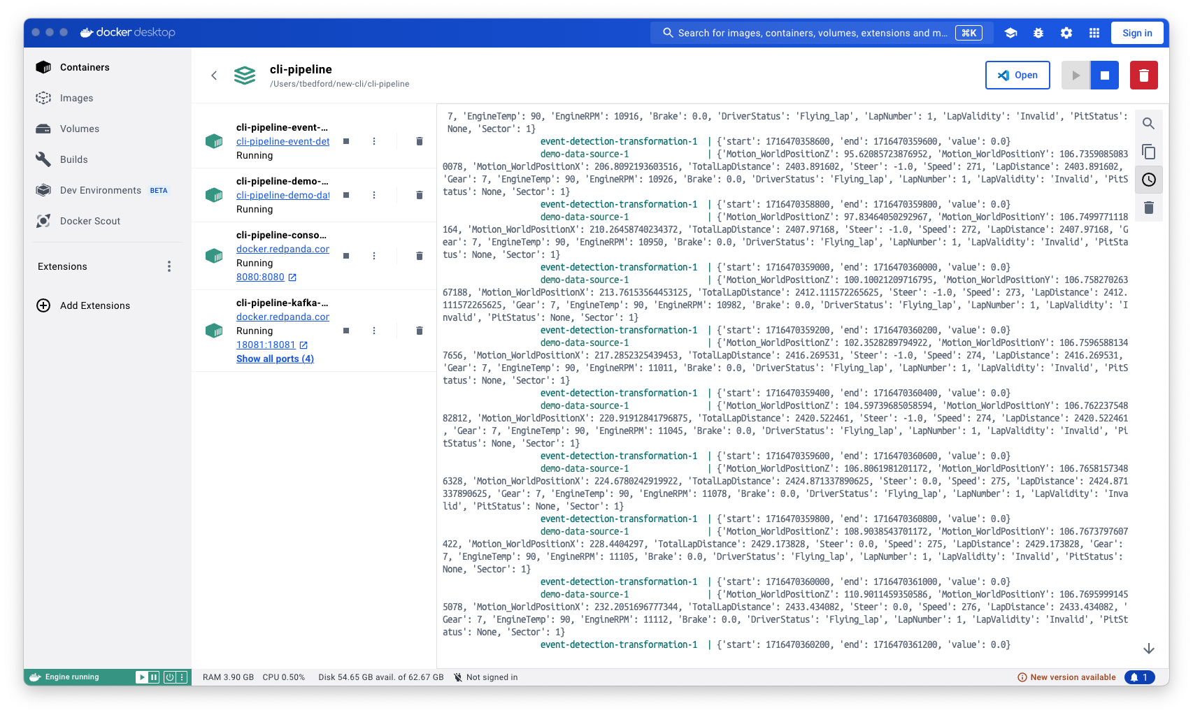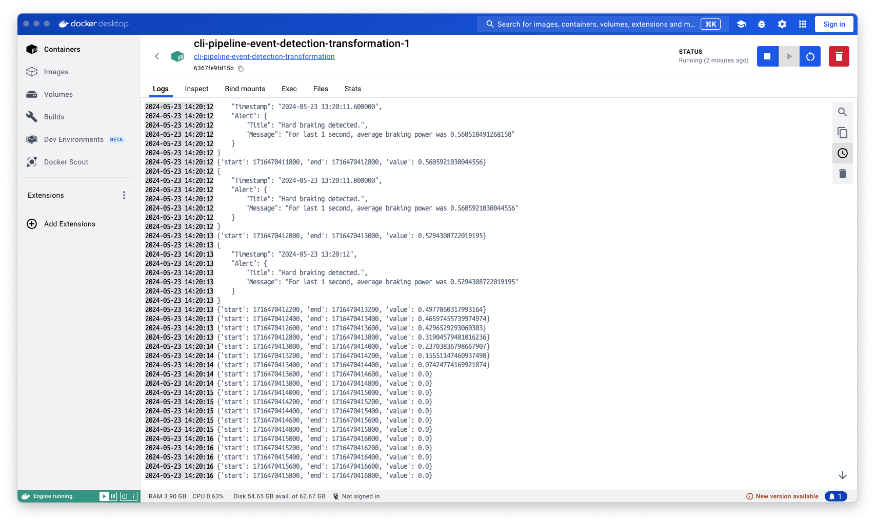 In this guide you will use the Quix CLI to create a simple streaming pipeline, and test it locally by running it in Docker. The pipeline generates telemetry data from a car and processes it to send an event whenever the driver applies a hard brake.