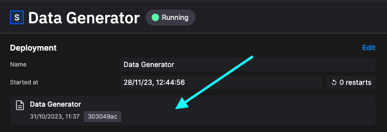 In the left-hand main navigation, click Deployments to see all the deployed services and jobs in the environment. Click Data Generator to select the deployment. This takes you to an extremely useful screen where you can: